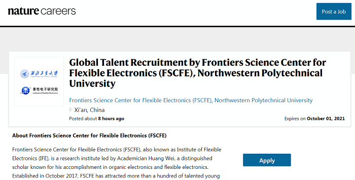 欢迎海内外优秀人才加盟,详情查阅Nature Careers官网:https://www.nature.com/naturecareers/job/global-talent-recruitment-by-frontiers-science-center-for-flexible-electronics-fscfe-northwestern-polytechnical-university-northwestern-polytechnical-university-npu-744247