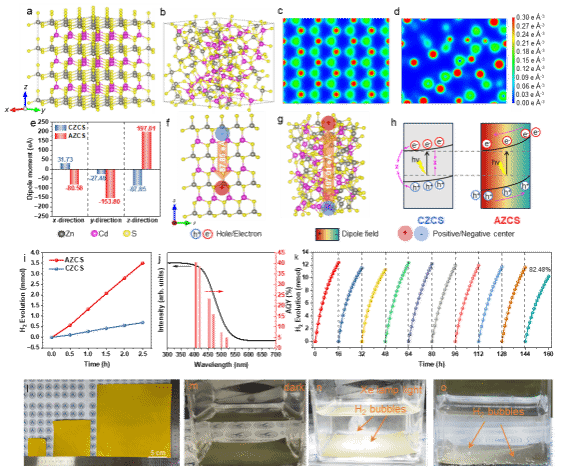 图1. (a)晶态ZnCdS和(b)非晶ZnCdS的原子排列和分布。(c)晶态ZnCdS和(d)非晶ZnCdS在(011)面上的形变电荷密度。(e)计算出的晶态ZnCdS和非晶ZnCd沿三个不同晶体方向的偶极矩。具有正电荷中心和负电荷中心的(f)晶态ZnCdS和(g)非晶ZnCdS结构示意图。(h)偶极场对电荷转移的促进作用示意图。(i)非晶ZnCdS和晶态ZnCdS在2.5小时内的产氢量。非晶ZnCdS的(j)波长依赖性表观量子产率(AQY)和(k)光催化稳定性测试。(l)不同尺寸(5/10/20 cm × 5/10/20 cm)的柔性光催化薄膜。(m)暗态、(h)氙灯光照和(i)自然光照下的光催化薄膜产氢效果。