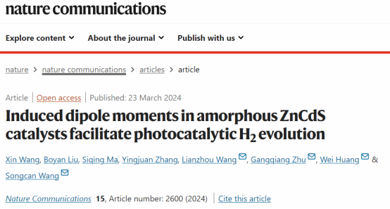 鉴于此,西北工业大学黄维院士团队王松灿教授课题组和昆士兰大学王连洲院士、陕西师范大学朱刚强教授合作,提出了一种打破ZnCdS光催化剂中长程有序原子的对称性而形成非晶ZnCdS,诱导偶极矩产生强偶极场,从而促进电荷分离和转移的新思路。这种非晶ZnCdS材料在负载1 wt.%低成本Co-MoSx助催化剂后的光催化制氢速率高达70.13 mmol g-1 h-1,比晶态ZnCdS高5倍以上,光催化稳定性长达160 h。通过简单的刮涂技术制备了20 cm×20 cm的ZnCdS/Co-MoSx柔性薄膜,可以在氙灯和自然光照下产生大量肉眼可见的H2气泡,具有规模化应用的潜力。相关成果以“Induced dipole moments in amorphous ZnCdS catalysts facilitate photocatalytic H2 evolution(非晶ZnCdS催化剂诱导偶极矩促进光催化制氢性能)”为题发表在Nature Communications上,yl9193永利博士生王鑫为第一作者,黄维院士、王松灿教授、昆士兰大学王连洲院士和陕西师范大学朱刚强教授为共同通讯作者。
