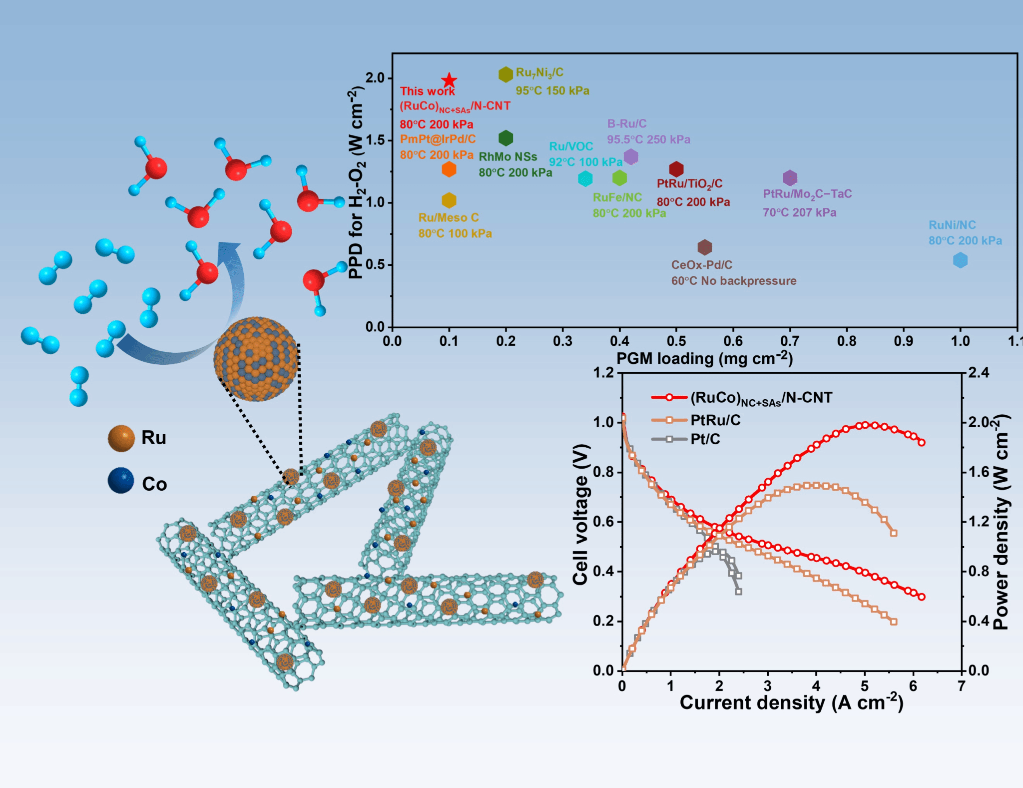 西北工业大学黄维院士团队韩云虎教授课题组在钌基HOR电催化领域取得重要进展,研究团队通过简单的浸渍和热解的方法制备了一种负载在氮掺杂碳纳米管上,由RuCo稀合金纳米颗粒和Ru/Co单原子组成的混合催化剂((RuCo)NC+SAs/N-CNT)。该电催化剂在碱性电解质中展现出良好的HOR活性(Jk, m= 7.35 A mgRu-1)和高稳定性。作者还证明了,HOR活性的提高是由于RuCo稀合金纳米颗粒与Ru/Co单原子的共存共同优化了催化剂表面的*H、*OH和*CO吸附,并且HOR发生的主要发生在稀合金位点上,单原子的存在进一步提高了稀合金位点的催化活性。当(RuCo)NC+SAs/N-CNT应用于AEMFC阳极时最高峰值功率密度可达1.98 W cm-2,而贵金属载量仅为0.1 mgRu cm-2,超过了大多数以贵金属为阳极催化剂的AEMFC所能达到的峰值功率密度,证实其拥有拓展AEMFC应用的潜力。该工作进一步证明了*H、*OH和*CO在催化剂表面的吸附对其催化性能有较大程度的影响,应对其进行合理调控,也揭示了Ru在AEMFC中的巨大应用潜力,并为今后碱性HOR电催化剂的开发提供了参考。研究成果以“Dilute RuCo Alloy Synergizing Single Ru and Co Atoms as Efficient and CO-Resistant Anode Catalyst for Anion Exchange Membrane Fuel Cells”为题发表在化学领域国际顶级期刊Angew. Chem. Int. Ed.上,yl9193永利韩云虎教授,奥克兰大学王子运教授与中科院上海应用物理所甘涛研究员为本文的共同通讯作者。在读硕士研究生崔智博、奥克兰大学任章豪与清华大学马超为该论文的共同第一作者。