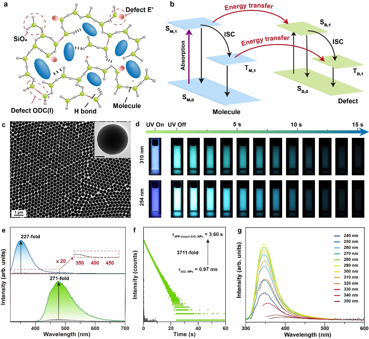 图 a) 缺陷与分子在SiO2 微球(SiO2 MPs)中的结构分布示意图;b)发光分子与缺陷态之间的能量传递示意图;c) 4-苯基吡啶掺杂的SiO2 MPs的TEM图像;d)4-苯基吡啶掺杂的SiO2 MPs在水中的余辉现象;e)4-苯基吡啶掺杂的SiO2 MPs与无掺杂SiO2 MPs的瞬态与稳态发射光谱对比;f)有无4-苯基吡啶掺杂SiO2 MPs余辉寿命对比;g)激发波长依赖的4-苯基吡啶掺杂SiO2 MPs的稳态发射光谱。