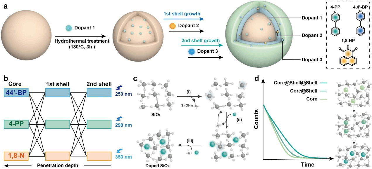 研究团队通过水热条件下的多次“假晶转变”,将4-苯基吡啶(4-PP)、4,4’-联吡啶(4,4'-BP)和 1,8-萘酰亚胺(1,8-NP)分别掺入不同壳层。电镜结果表明,所制备的核壳结构SiO2微球形貌规整且具有高度单分散性。当激发波长由 250 nm 调控至 350 nm时,余辉颜色由蓝色调控至青色和橙色,余辉持续时间最长可达10 s。