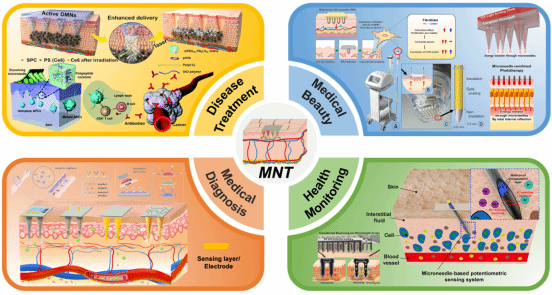 图1. 微针疗法用于疾病治疗、医学诊断、健康监测和医学美容