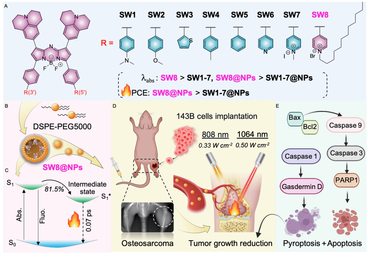具有近红外二区(NIR-II,1000-1700 nm)吸收和高光热转化效率(PCE)的小分子光热剂(PTA)是治疗深部肿瘤如骨肉瘤的有效媒介。至今,小分子近红外二区光热材料的开发主要基于构筑供体-受体-供体(D-A-D/D')结构。本研究通过受体工程,制备了一种供体-受体-受体(D–A–A')结构的NIR-II aza-BODIPY基光热剂 (SW8),用于1064 nm激光介导的骨肉瘤光热治疗(图1)。将供体基团变为受体基团,aza-BODIPYs的吸收最大值从NIR-I区(~808 nm)到NIR-II区(~1064 nm)发生了显著的红移。此外,SW8可以自组装成具有NIR-II强吸收和超高PCE(75%,1064nm)的纳米颗粒SW8@NPs。这种超高PCE主要源自非辐射衰变途径,与传统的内转换和振动驰豫途径相比,该途径的衰变速率提高了100倍。最后,细胞和动物应用结果表明,1064 nm激光介导下,SW8@NPs可通过诱导细胞凋亡和焦亡的协同途径实现骨肉瘤的光热治疗,消融深部肿瘤,且副作用小(图2)。该研究不仅阐明了一种时空精准调控治疗深部肿瘤的方法,也为构建高性能小分子NIR-II光热剂提供了新的策略。