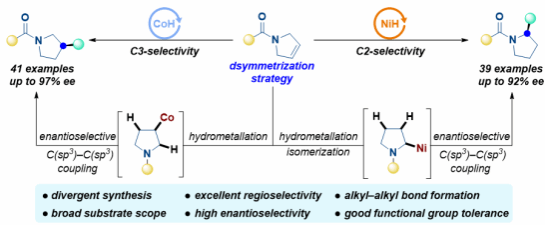 近日,西北工业大学黄维院士团队荣子强教授课题组在不对称C(sp3)-C(sp3)交叉偶联领域取得重要进展。研究团队开发了廉价金属钴和镍两种过渡金属催化体系,以优异的区域和对映选择性实现了非活化环状内烯烃的氢烷基化,为不对称C(sp3)-C(sp3)交叉偶联研究提供了新思路。该策略从简单易得的3-吡咯啉类化合物出发,采用去对称化策略,实现了手性2-取代/3-取代吡咯烷类化合物的立体发散式高效合成,该反应条件温和、底物普适性强,为不同取代手性吡咯烷尤其是传统方法难以合成的3-取代手性吡咯烷的精准构筑提供了高效、通用的方案。研究成果以“Divergent Access to Chiral C2- and C3-alkylated Pyrrolidines by Catalyst-Tuned Regio- and Enantioselective C(sp3)–C(sp3) Coupling”为题发表在化学领域国际顶级期刊J. Am. Chem. Soc.上,并被选为封面文章,在读博士研究生王旭超为该论文的第一作者。