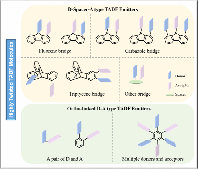 高度扭曲TADF材料的发展仍处于相对早期的阶段。在我们看来,设计、合成具有强深蓝色发射的TADF材料目前对实现高效全彩OLED显示屏具有重要意义。这种具有扭曲结构的有机化合物可以破坏平面共轭,为设计具有深蓝色发射的高性能TADF材料提供了一个很好的方法。此外,空间电荷转移可以通过调整分子结构来实现,例如通过增强空间位阻,实现高效的深红和近红外发射。这将弥补近红外区域TADF材料的稀缺性。最后,文章还展望了扭曲TADF分子与空穴传输和电子传输基团的连用,其中单层TADF-OLED的理想情况可能得以实现。