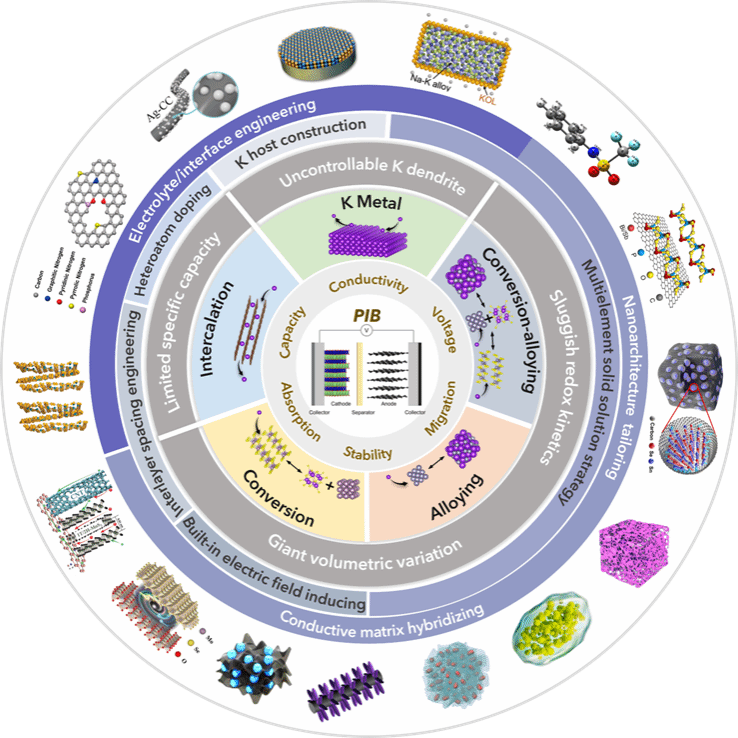 追求低成本、高导电性、高容量、高化学和结构稳定性的电极材料始终是可充电电池领域研究的核心。在这篇文章中,作者从材料合成、电化学特性和储能机制等方面系统、全面地综述了五种类型的钾电池负极材料,包括钾金属、插层、转换、合金和转换合金负极。强调了特定负极的固有优势和面临的现实挑战(钾枝晶问题、结构不稳定、动力学迟缓等),讨论了现有优化策略背后的基础科学问题(宿主构建、内置电场引入、多元合金策略等)。此外,为了超越现有的技术瓶颈,实现理想的钾电池负极功能性,一些潜在的研究课题被提出:1)对具有合适电子结构、热力学和电化学动力学性质的负极材料进行方法学预测;2)将多反应机制协同引入负极材料开发中;3)新材料需要在亚纳米尺度上实现可控合成和改性,成熟的材料体系需要探索绿色、高产、低耗能的规模化生产路线;4)普遍存在的低首次库伦效率问题需要有针对性的改善;5)界面性质、结构变化和储能机制的揭示需要结合高通量计算、多物理场模拟和先进原位表征技术;6)其他电池组件需要更集中地研究以匹配负极材料;7)应建立更科学的电化学性能评估体系。该综述文章将对钾电池和其他储能系统的研究和发展提供一定的借鉴意义。