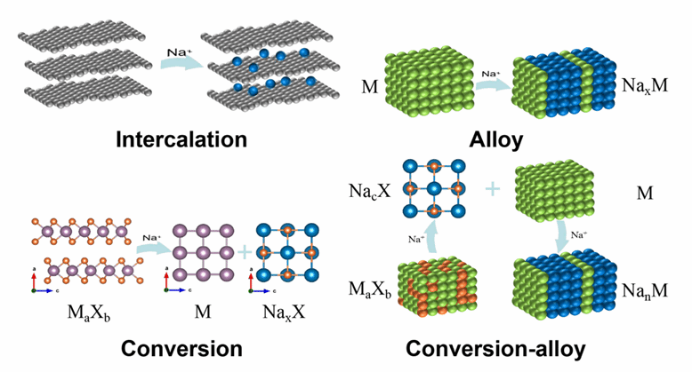 图2. 插入、转换、合金、转换-合金负极材料钠离子储存机制示意图