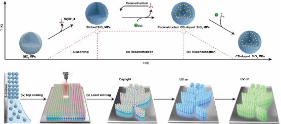 单分散CD掺杂SiO2微球合成及其光子晶体构筑示意图。合成过程包括五个阶段:(i) SiO2纳米颗粒的表面层在高温下逐渐溶解形成正硅酸;(ii) CD通过SiO2骨架的水解和重聚平衡被掺杂到SiO2基质中;(iii) 在冷却反应过程中,溶解的正硅酸重新凝结,进一步封装CD形成单分散的荧光CD掺杂SiO2微粒;(iv和v) 通过连续浸涂策略制备光子晶体的示意图,然后通过激光辅助蚀刻策略创建光子晶体图案; (vi)设计的花型光子晶体图案在不同照明条件下显示出多种光学状态,包括在日光下产生角度依赖的结构颜色,365nm照射下的蓝光发射,以及停止紫外线激发后的绿色余辉。