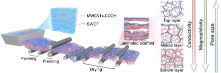 通过调控主体材料各层级中羧基化多壁碳纳米管与针叶木纤维的比例,实现了电导率、亲镁性和孔径在垂直方向上的梯度分布。同时,低成本的针叶木纤维和羧基化多壁碳纳米管以及可批量化生产的造纸工艺为柔性电极的实际生产和应用奠定了基础。