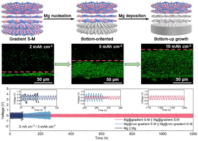 三梯度结构设计的优点在于:底层的高电导率、亲镁性和小孔径特征可以均匀镁离子通量,诱导镁金属优先形核/沉积;顶层的绝缘性、疏镁性和大孔径特征可以促进镁离子快速传输,抑制“顶部生长”;中间过渡层则可以避免因顶层与底层梯度差异过大而造成的金属分层。以上特性所诱导的自下而上沉积行为显著提升了梯度主体材料的镁沉积/剥离可逆性。