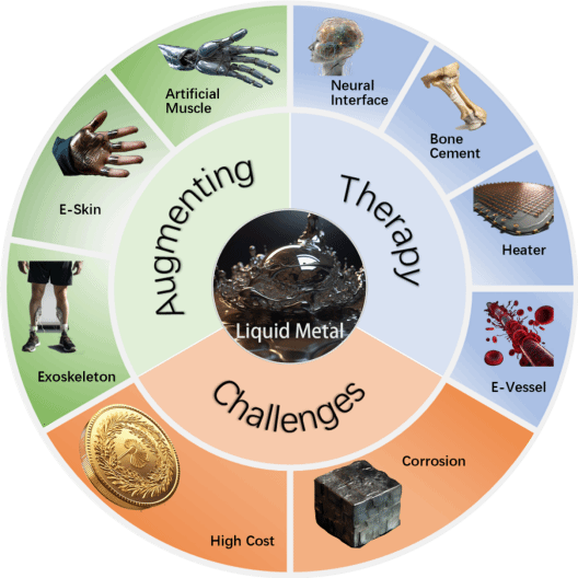 随着生活水平的提高,人们对使用具有优异性能的生物医疗设备产生了更多的需求。液态金属(镓铟共融合金、镓铟锡合金等)具有较好的生物相容性、优异的可拉伸性、极佳的导热和导电性,对于制备高性能可拉伸生物医学设备潜力巨大。近年来,人们在液态金属基可拉伸生物医学设备方面进行了大量探索工作。在这篇文章中,作者以疾病治疗和人体机能增强为主题,全面综述了液态金属基电子材料的制备方法,总结了代表性的液态金属基骨水泥、神经接口、电子血管、柔性加热器、外骨骼和电子皮肤等可拉伸生物医学设备的构建方法与性能,并讨论了这类生物医学设备现存的问题。此外,作者还提出了一些具有潜在研究价值的课题,如利用蛋白质对液态金属纳米靶向药物改性等。该综述文章对于开发液态金属基新型可拉伸生物医学设备具有启示意义。